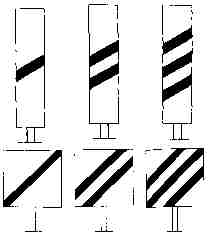 Kwadratowa tablica niebieska, z czarną i białą obwódką, ustawiona po przekątnej pionowo, a na niej jeden biały pasek pionowy (We3a). W razie potrzeby na wierzchołku niebieskiej tablicy umieszcza się małą białą kwadratową tablicę z czarną obwódlą i czarną literą "L" (We3b)