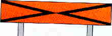 Pomarańczowa tablica pozioma, a na niej dwa czarne kąty - jeden obok drugiego, stykające sie wierzchołkami, ustawiona skośnie do toru